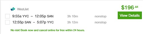 WestJet is showing non-stop flights from Calgary to San Diego, California in May for $253 CAD roundtrip including taxes.