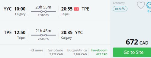 2. Go to Momondo and search for a flight from Calgary to Taipei, Taiwan (TPE) using the recommended dates below. Click through to Fareboom for booking.