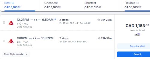 3. Search for a flight from Calgary (YYC) to Auckland, New Zealand (AKL)