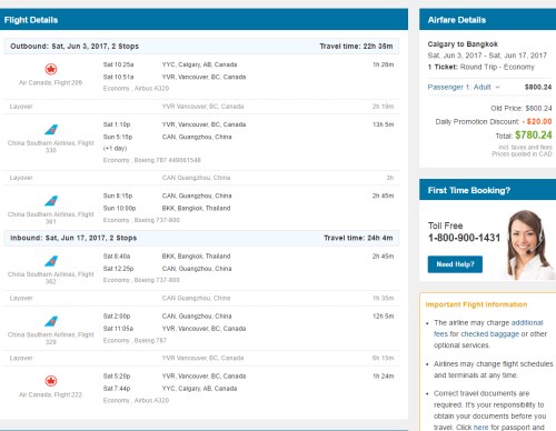 You can also fly into one city, and home from another, for the same price. For example, fly from Calgary to Bangkok, Thailand and then fly home from Ho Chi Minh City, Vietnam - for a total price of $780 CAD roundtrip.