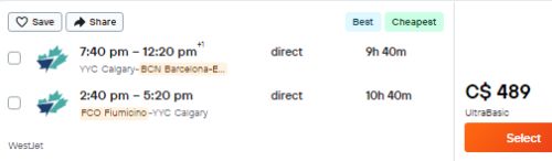 WestJet is showing some cheap open-jaw Multi City flights from Calgary to Barcelona, Spain and then from Rome, Italy to Calgary for $489 CAD roundtrip including taxes.