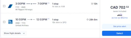 3. Search for a flight from Calgary (YYC) to Tokyo, Japan (NRT) or one of the other destinations above.